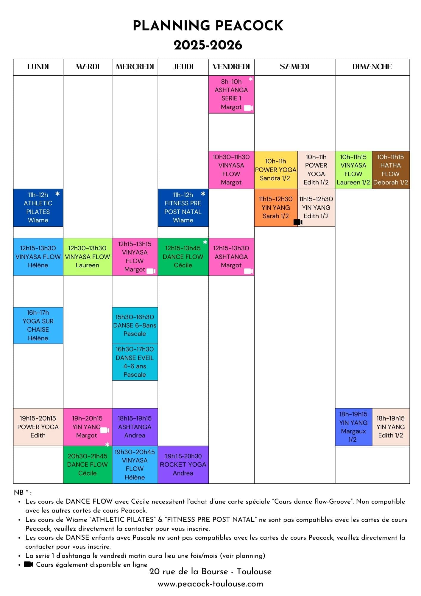 Le planning du yoga studio Peacock (Septembre 2025 – Juin 2026)